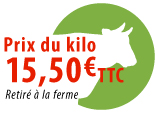 • Bourguignon (4,0 kg) • Rôti (3,2 kg) • Steak à griller (2,2 kg) • Pot au feu (2,0 kg) • Côte de bœuf ou filet (1,3 kg) • Jarret à mijoter (1,0 kg) • Faux filet (0,7 kg) • Bavette d’aloyau (0,3 kg) • Basse côte à griller (0,3 kg) |